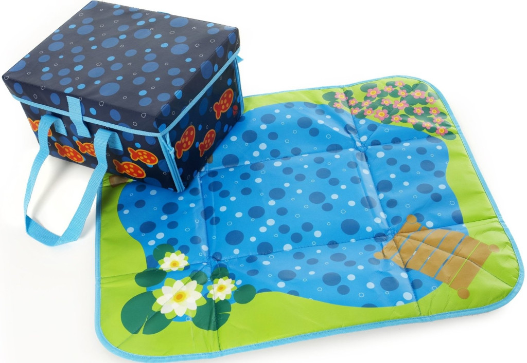 64x56 cm méretű játszószőnyeg tóra emlékeztető színvilággal, füles játéktartódobózzá alakítható.