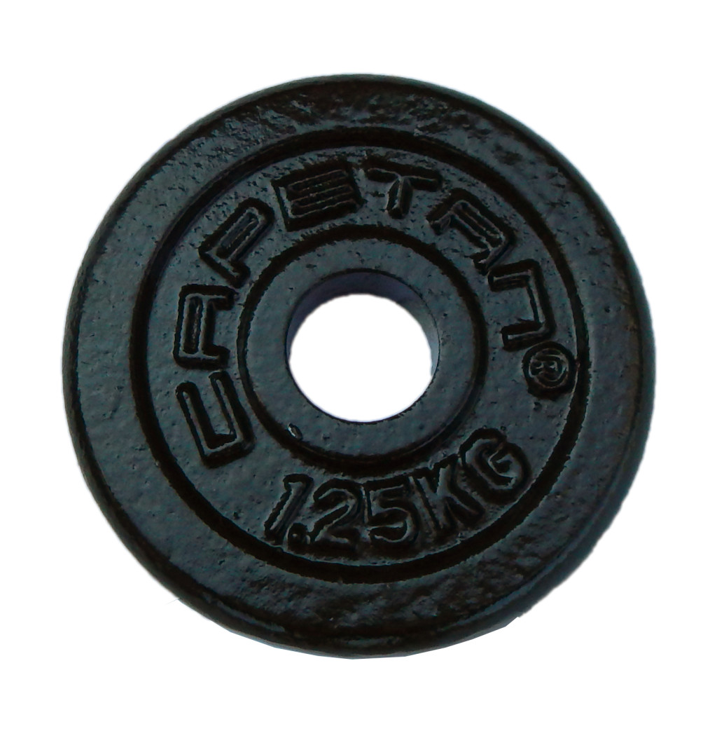 Capetan® 1,25kg acél súlytárcsa kalapácslakk felülettel 31mm lukátmérővel: Az ár 1db-ra vonatkozik. A súlyzó tárcsa felületének kialakítása sorja mentes, a kalapácslakk festés esztétikus felületet biztosít. A 30mm átmérőjű súlyzórudakhoz való kialakítású.