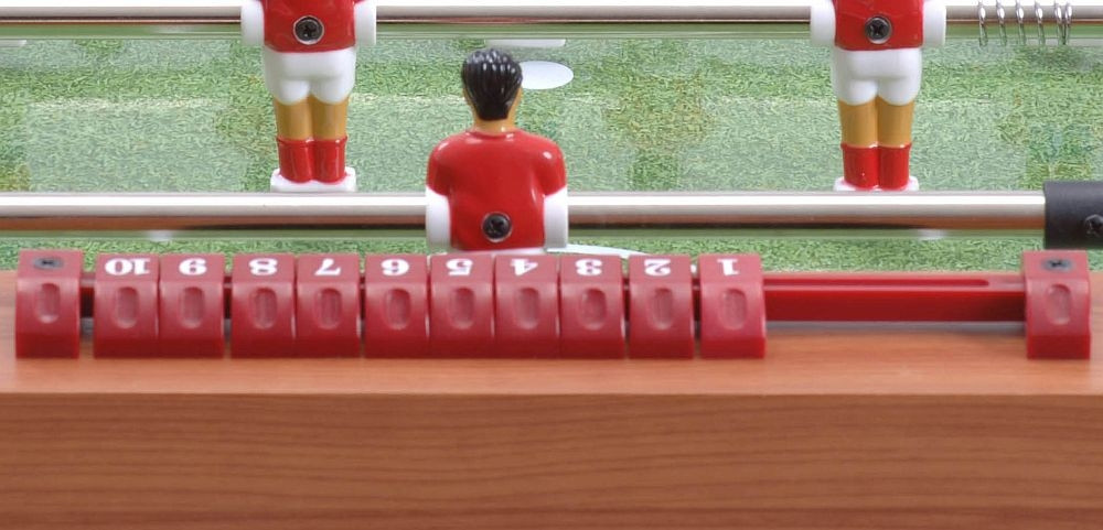 A játéktér MDF anyagú, színe sötét cseresznye, fedőrétege melamine, élethű fű mintázattal, mely olyan érzést kölcsönöz a fiatal játékosoknak mintha football pályán játszanának.