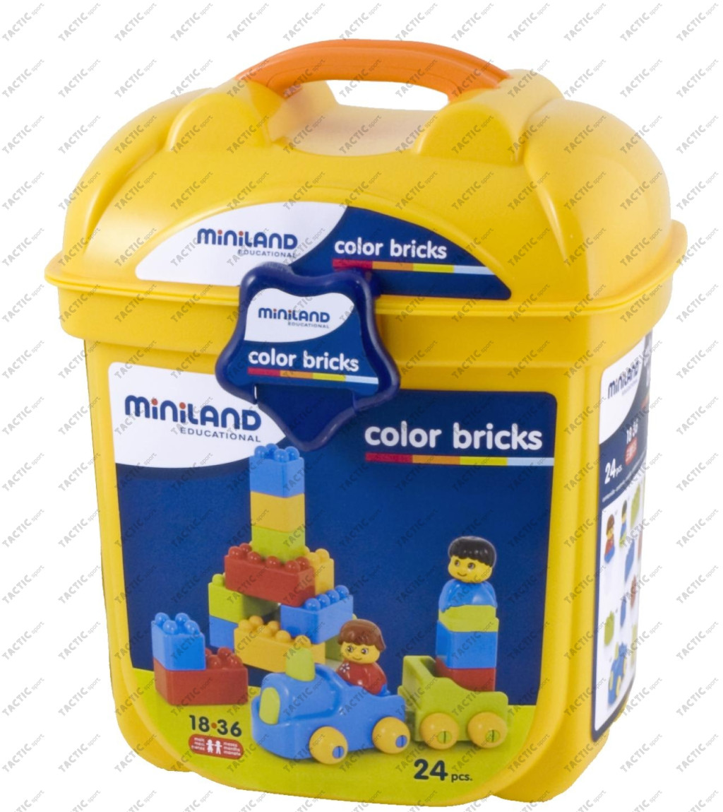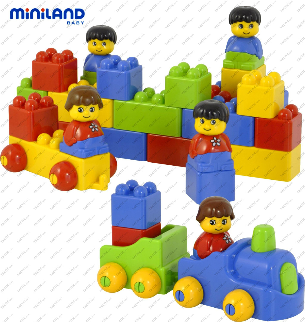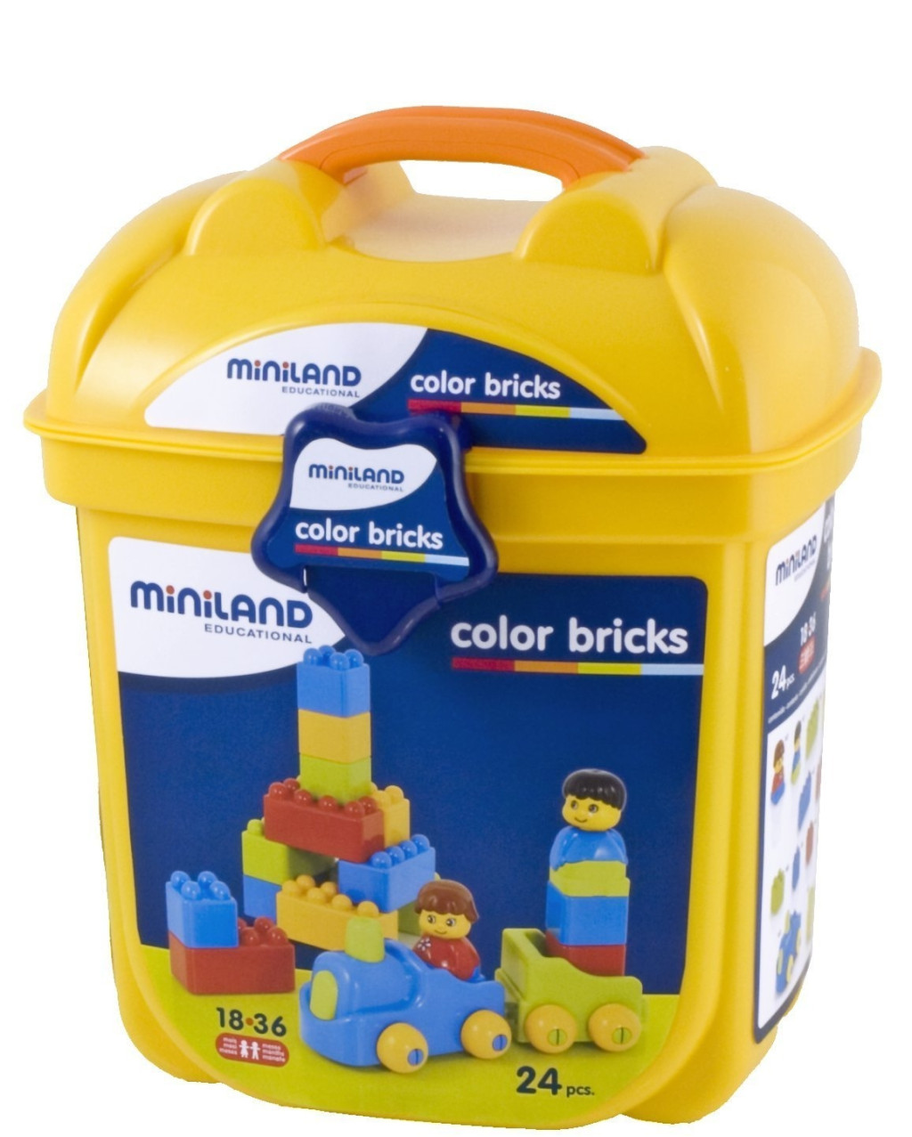 Első építőkockám építőjátékkészlet figurás elemekkel, 24 db-os készlet műanyag tárolóban, Miniland Termékleírása