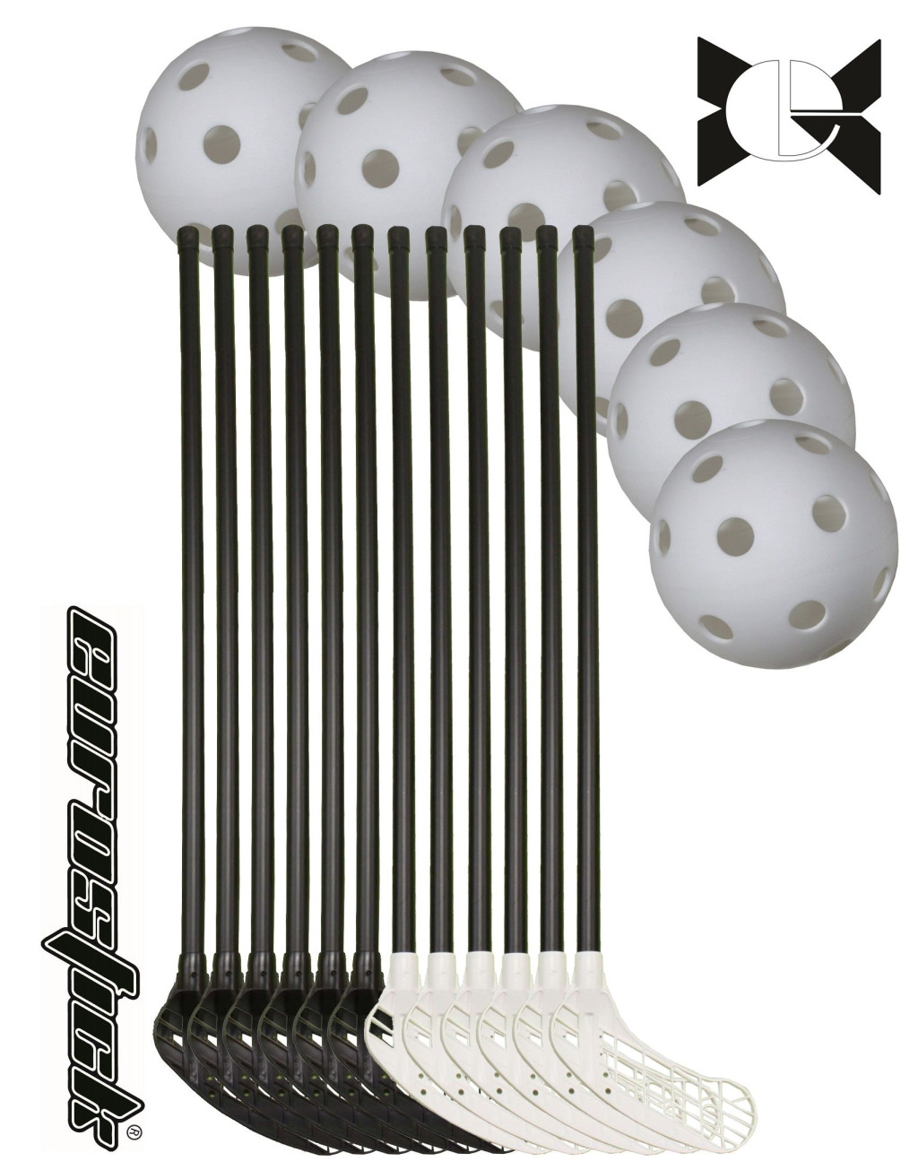 Újdonság 2016! Foorball svéd senior szett EUROSTIC MASTER 18 részes , az ütők ívelt konkáv fekete/fehér színű fejjel fekete nyéllel , 12 db 95/106 cm ütő 6 db labdával