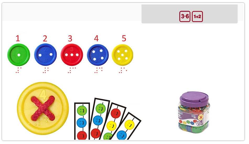 Fűzőjáték, nagy gombokkal 1-től 5 lyukkal és élénk színekkel. A rendszerezés és osztályozás fejlesztőeszköze.