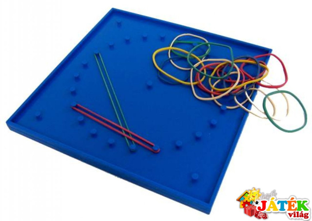 6 db geometriai tábla szögekkel (15 cm) 6 féle színben, 2 oldalas; 180 db gumi karika+24 db activity.