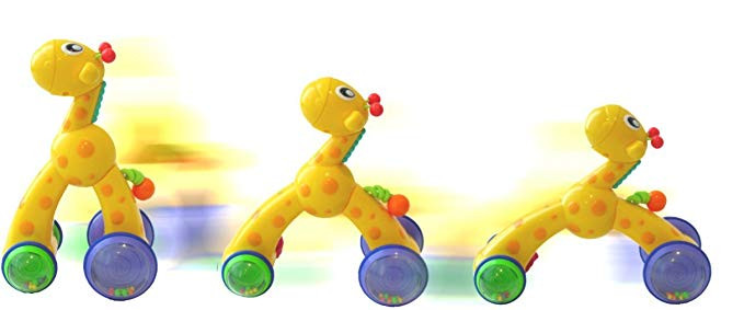 A játék mechanizmusa a fej lenyomásával indul be. Könnyű kezelni, csúszásgátlóval ellátott kerekekkel. Elősegíti a gyerekek mobilitását és mozgását is, a mászástól az első lépésekig.