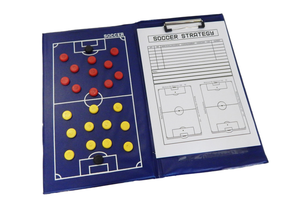 Mágneses, clippes taktikai tábla, foci, írható papírtömbbel, és mágneses a játéktéren jól mozgatható játékost szímbólizáló kerek csapat figurákkal