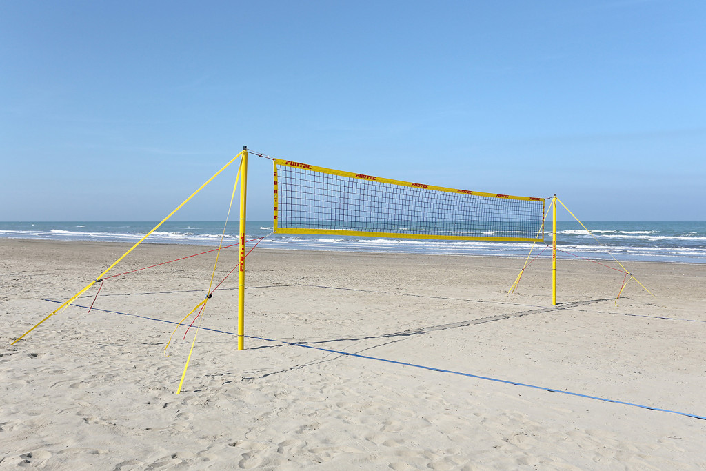 Strandröplabda Beach Champ mobil versenypálya szet 8,5m Pro Beach verseny hálóval 2,5cm pályacsíkkal, antennával és antenna tartóval, 8x16m pályamérethez. 3 magasságba állítható háló 220,243170, beach teniszhez is alkalmas.