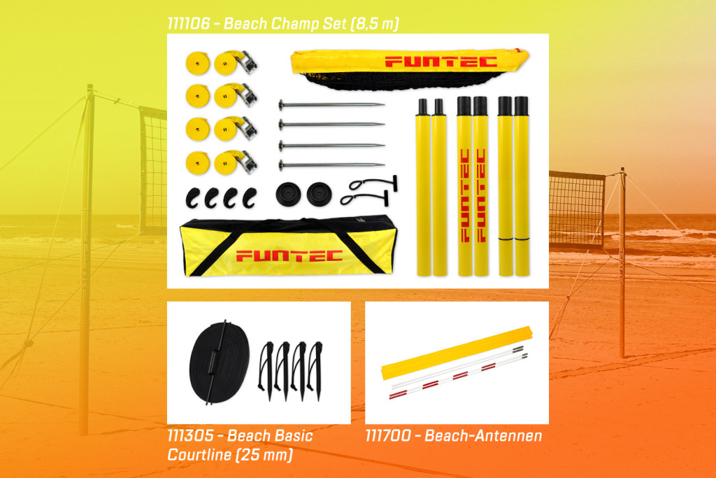 Strandröplabda Beach Champ mobil set 8,5m Pro Beach verseny hálóval 2,5cm pályacsíkkal, antennával és tartóval Termékleírása