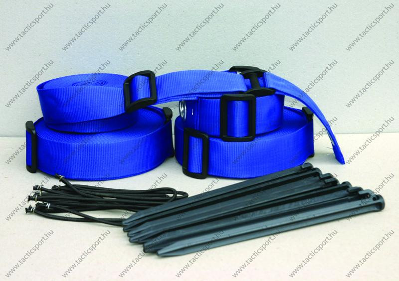 18 x 9 m-s állíthatós strand röplabda/tenisz pálya jelölő szalag készlet. Szalag végei ponyvakarikázva, feszítő gumizsinórral és műanyag karókkal kompletten, 50 mm széles szalagból. A készlet tartalma: 2 db. 18 m, 2 db. 9 m szalagot, 8 db. feszítő gumizsinórt, 8 db. műanyag karót.