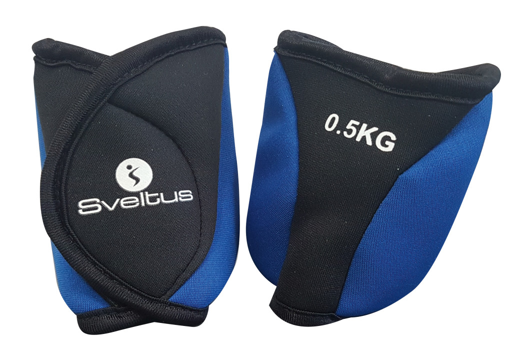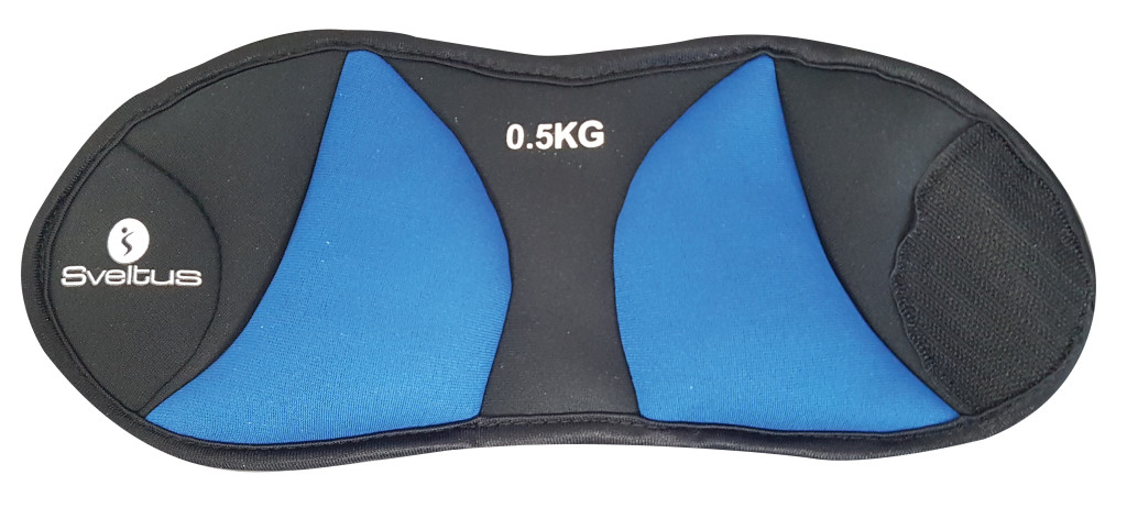 Csuklósúly pár 2*0,5 kg fekete-kék színben. Neoprén anyag homokkal töltve, tökéletesen illeszkedik a csuklóra vagy bokára.