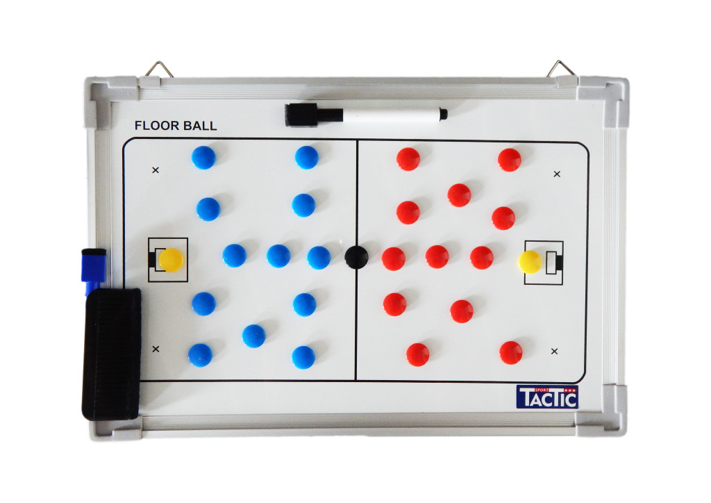 Könnyű alumínium tábla fehér író felülettel, filctollal írható, szivaccsal letörölhető, mérete 30x45 cm. Mágneses, két csapatot megtestesítő figurákkal modellezhető a mérkőzés várható menete. Floorball