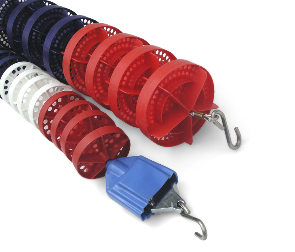 Uszodai pályaelválasztó kötél fém sodronnyal verseny modell Budapest, 15 cm átmérő micro fánkkal, 25 m, feszítővel és beakasztó horoggal